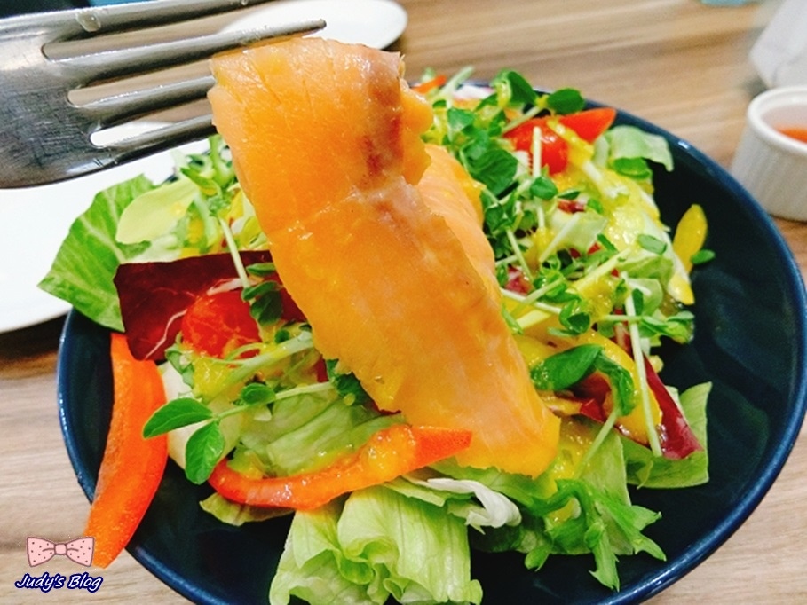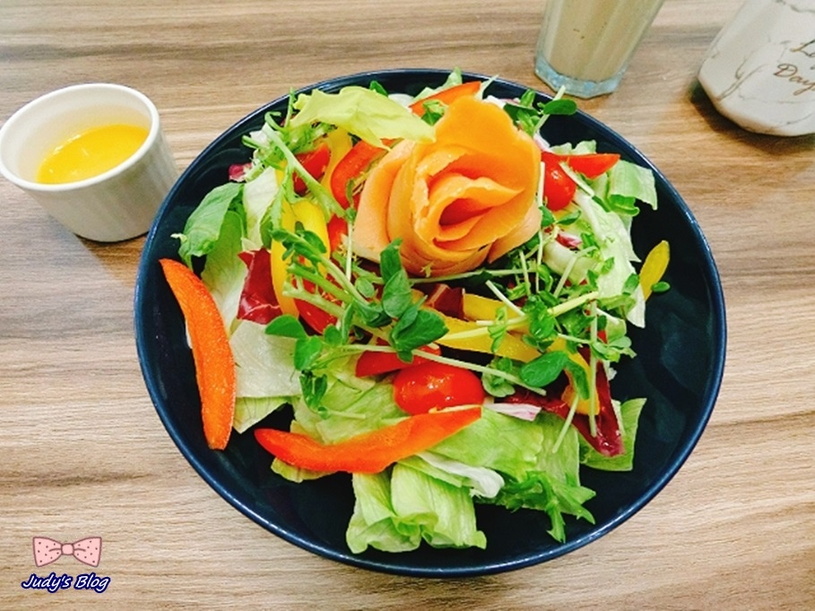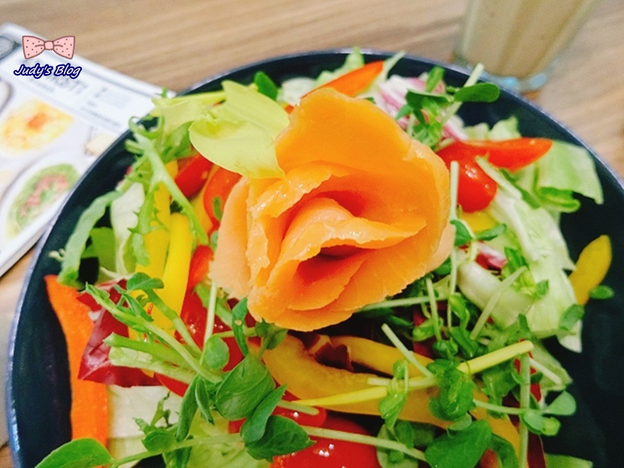 接著沙拉馬上就上來了中間的燻鮭魚捲成如玫瑰花瓣的形狀,放在鋪滿生菜的器皿之上,增加了視覺的效果