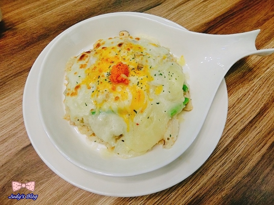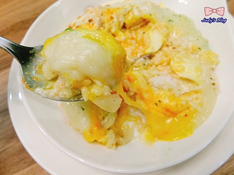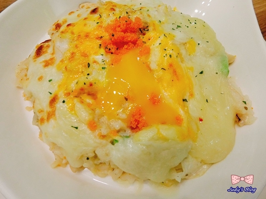 滿滿的起司上面放了一小球的明太子,而透過叉子輕輕一劃….整個蛋液就吸睛的流出來嚕~